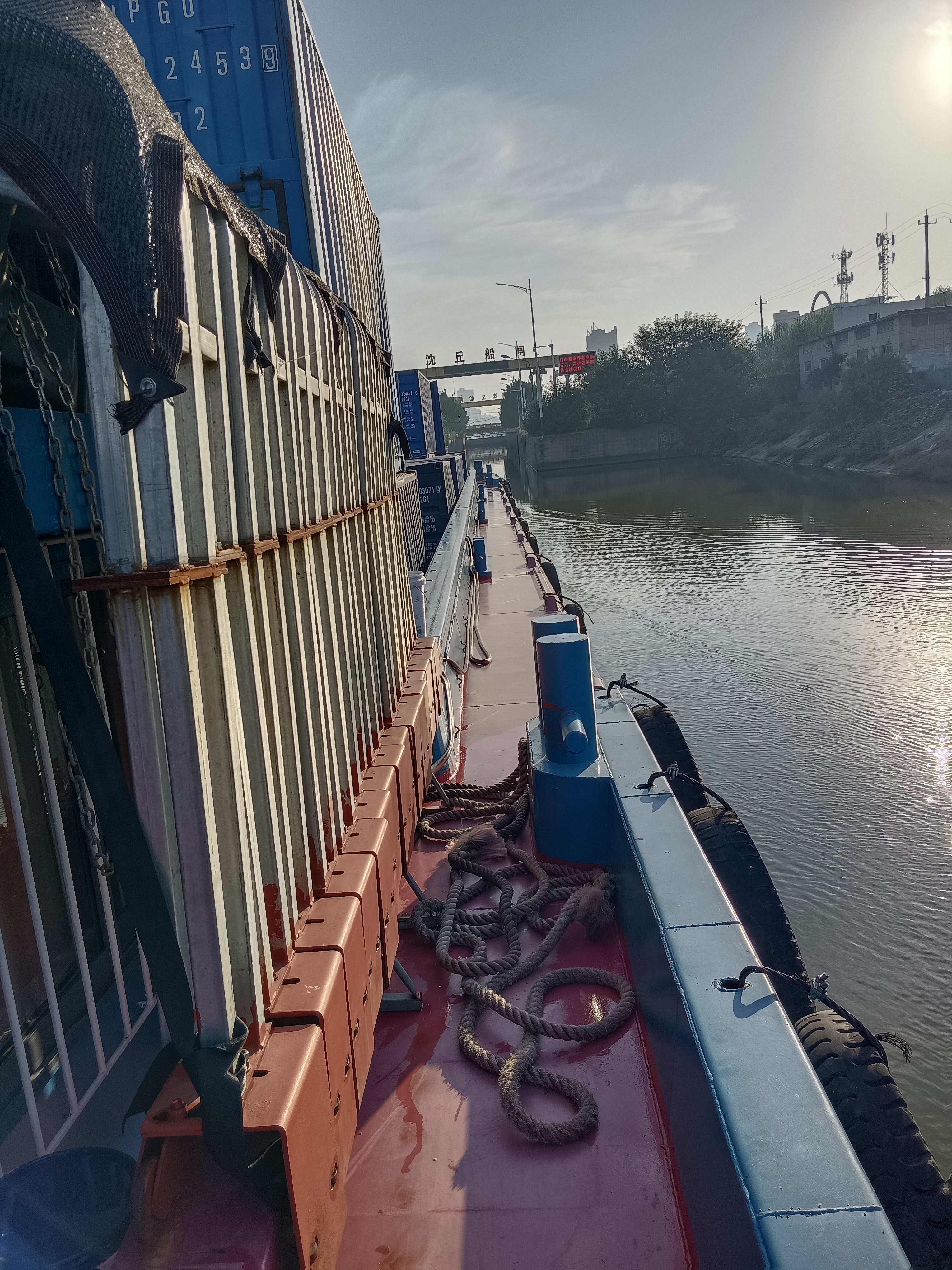9月25日傍晚,船老大董海軍吊裝好了36個(gè)集裝箱,從項(xiàng)城港啟航了。他運(yùn)送的貨物是純堿,生產(chǎn)玻璃的原材料,目的地是安徽鳳陽(yáng)港。這次,記者一行從水路出發(fā),隨行采訪。