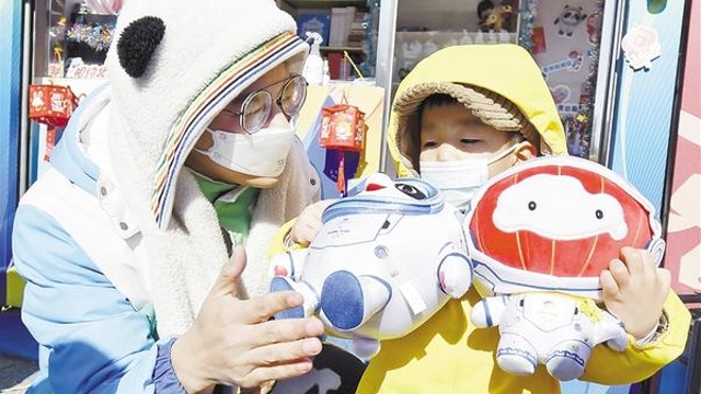 2月16日,北京冬奧會(huì)城市志愿者張文全(左)為一名兒童介紹冬奧會(huì)和冬殘奧會(huì)吉祥物。
