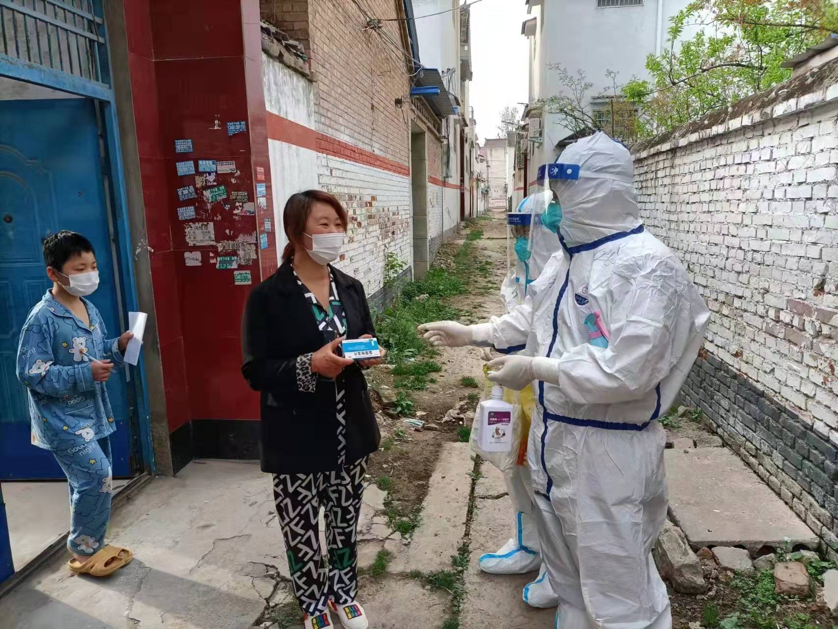 到達太康后,王群禮被分到了城關(guān)回族鎮(zhèn)封控區(qū)進行入戶核酸采集,當(dāng)時的他也很緊張,認真地穿防護服,熟記采集核酸的每一個動作要領(lǐng),然后投身抗疫最前線。在入戶采樣的時候,王群禮發(fā)現(xiàn)有一個小女孩獨自在家,她每次聽到敲門聲都是先開一點縫,悄悄觀察外面,當(dāng)看到是防疫人員時,才慢慢打開門?!拔铱梢钥闯鏊目謶趾蜔o助,不知道她晚上怕不怕,會不會做飯,問她怎么吃飯,她也不說話,我心里很不是滋味?!睆哪翘扉_始,王群禮每次入戶采核酸的時候,就幫她帶點吃的,王群禮會把他的早餐留給她,還把自己的水果、零食也都送給她。