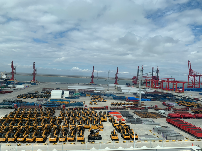 由于疫情防控的原因,記者沒能進入港口核心區(qū),只能站在港口辦公大樓樓頂遠眺港口。站在樓頂,港口景觀盡收眼底——挖掘機和風機葉片被“碼”的整整齊齊,正待裝船出口;機器不停運轉(zhuǎn),給停靠的船只裝卸貨物;重型貨柜車進出有序、川流不息。而令人驚奇的是,諾大的港口空無一人。