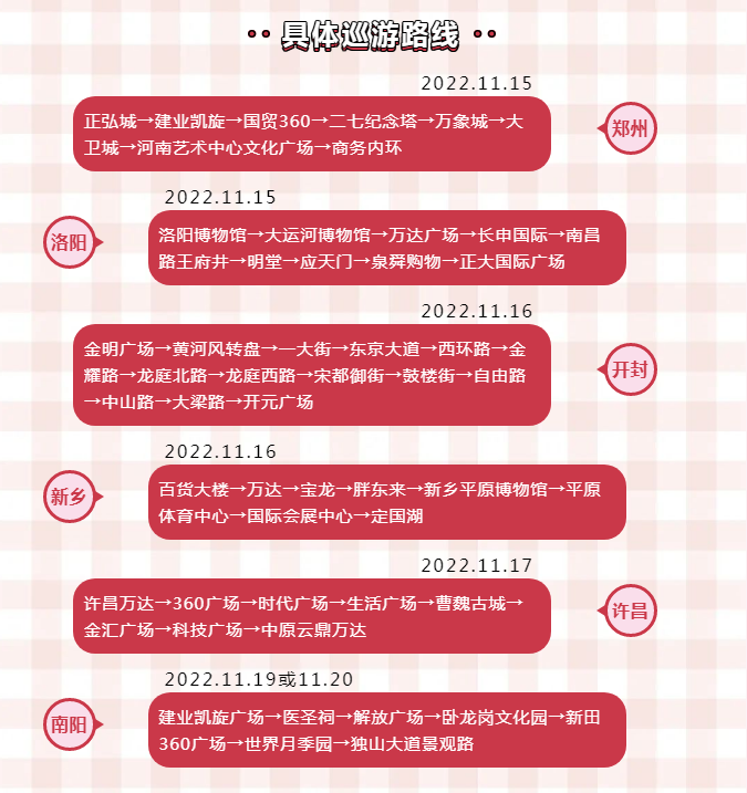 巡游活動將會陸續(xù)在開封、洛陽、新鄉(xiāng)、許昌、南陽五市展開,途經(jīng)各個地市商圈及市中心地帶,馬上參考我們下方的路線,追著我們的車隊(duì)一起跑起來吧!