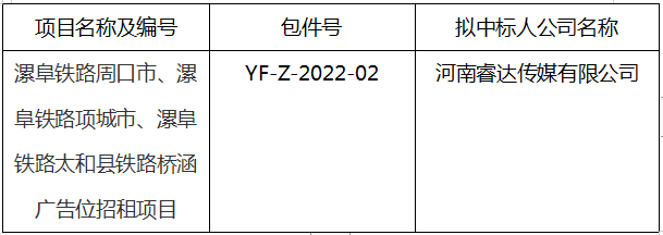 漯阜鐵路周口市、漯阜鐵路項城市、漯阜鐵路太和縣鐵路橋涵廣告位招租項目評標結(jié)果公示