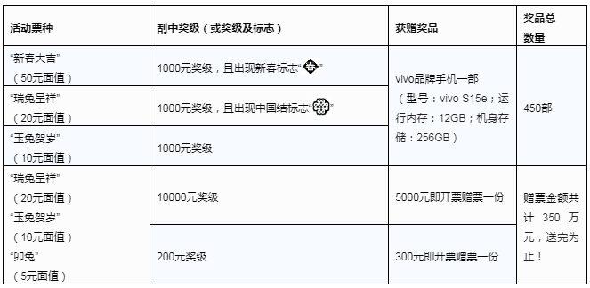 活動期間,購彩者在我省任一體彩銷售實體店購買指定活動票種,若單張彩票刮中符合獎勵條件的獎級(或獎級及標志),經(jīng)實體店終端兌獎設(shè)備(IVT或BCR)成功完成獎金兌付及促銷兌獎掃描后,另可獲贈相應(yīng)的獎品。獎品數(shù)量有限,送完為止,詳見下表: