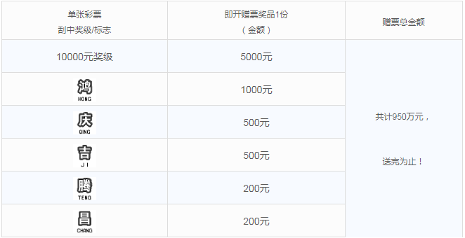 活動期間,購彩者在我省任一體彩銷售實體店購買指定活動票種,若單張彩票刮中符合獎勵條件的獎級或標(biāo)志,經(jīng)實體店終端兌獎設(shè)備成功完成獎金兌付(如中獎)及促銷兌獎掃描后,即可獲得即開票贈票獎品一份??傤~有限,送完為止,詳見下表: