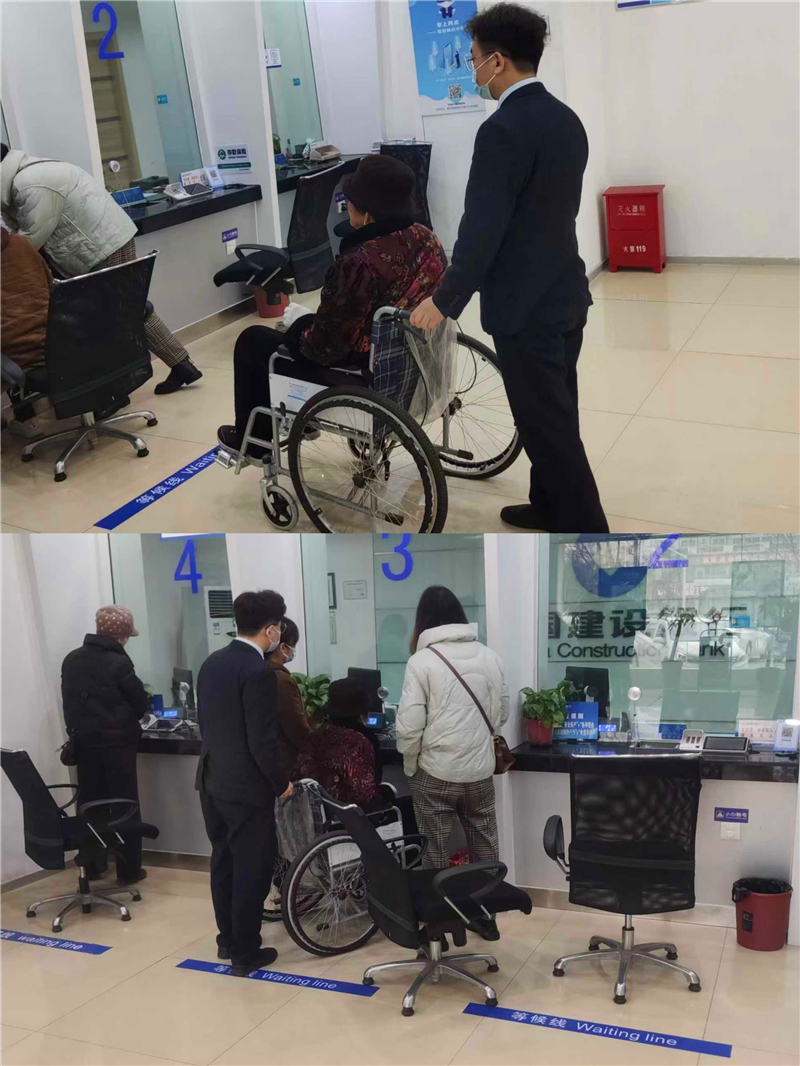 3月27日上午11點左右,項城蓮花大道支行大堂經(jīng)理張云磊在門口引導(dǎo)客戶時,發(fā)現(xiàn)兩位客戶扶著另一位客戶走進(jìn)網(wǎng)點。注意到客戶雙腿行走不便,他立即推來輪椅,把客戶扶到輪椅上。三位客戶不熟悉銀行辦業(yè)務(wù)流程,大堂經(jīng)理張云磊全程跟隨指導(dǎo)辦理業(yè)務(wù)。經(jīng)詢問,大堂經(jīng)理得知客戶前來辦理社??せ顦I(yè)務(wù),以便領(lǐng)取殘疾人補貼。大堂經(jīng)理立即幫他安排綠色通道,幫助家屬推輪椅到柜臺辦理,在一旁指導(dǎo)客戶填單跟簽名。