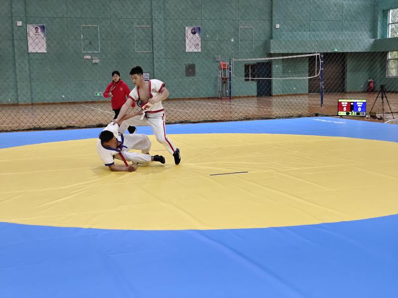 當日,河南省第九屆少數(shù)民族傳統(tǒng)體育運動會民族式摔跤競賽項目在周口師范學(xué)院老體育館開賽。絆跤是首個登場的跤種,9支代表隊參賽。該跤種以體重級別分組進行雙敗淘汰賽,共有52kg、62kg、74kg、87kg和87kg以上等5個公斤級,對應(yīng)5個一等獎。經(jīng)過激烈角逐,來自漯河市、周口市和河南大學(xué)代表隊的5名選手獲得一等獎,我市選手李祥楷、劉小濤分別獲62kg、87kg一等獎。