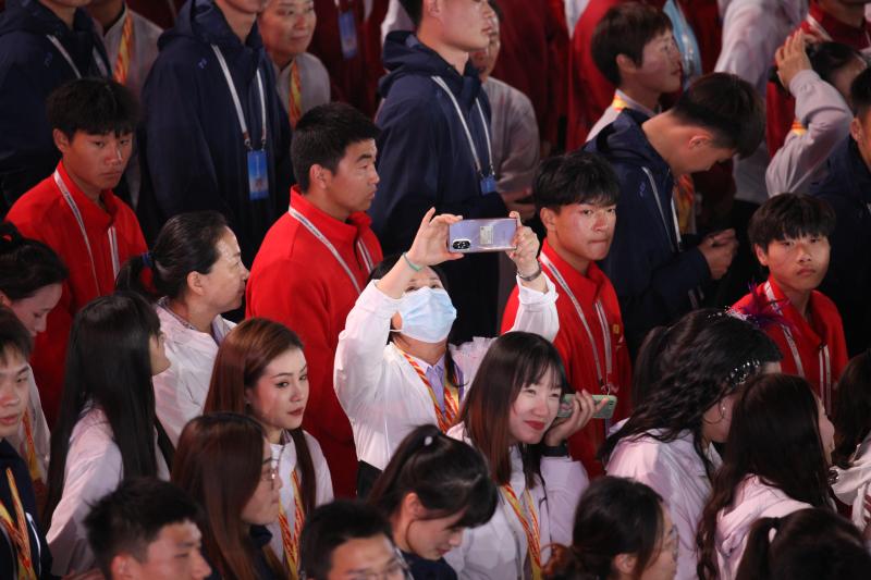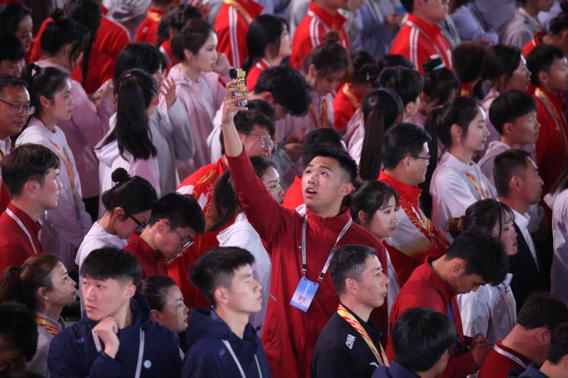 閉幕式上,來(lái)自全省各地的運(yùn)動(dòng)員用手機(jī)記錄下精彩瞬間。記者 劉俊濤 攝