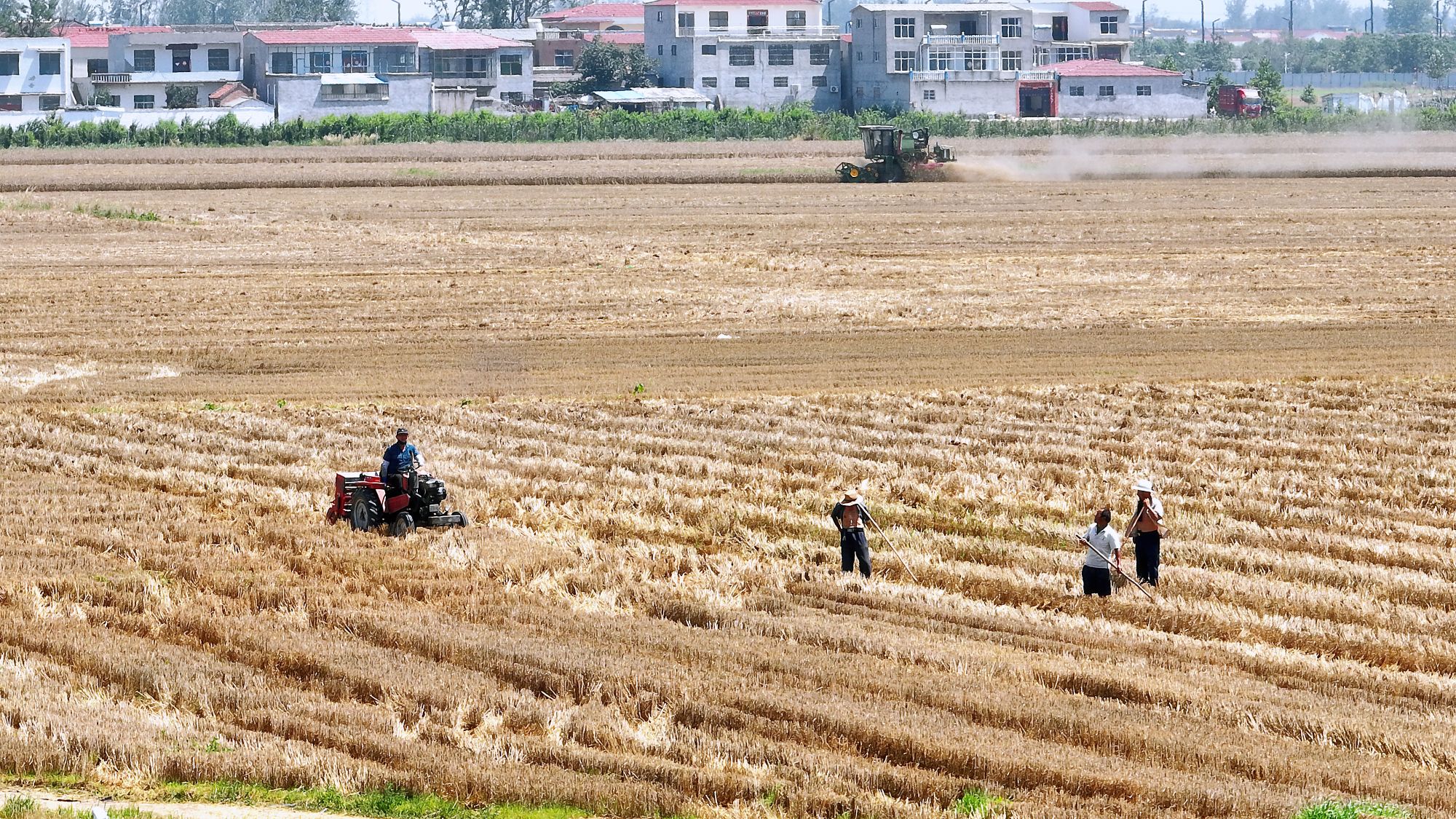 5月31日下午3時(shí)許,在許灣辦事處大張行政村村民田地里,收割機(jī)、點(diǎn)播機(jī)、拖拉機(jī)等農(nóng)用機(jī)械來往穿梭,村民手拿簸箕、木锨、掃帚等工具等待在地頭邊,收割下來的麥子被迅速攤開在道路上,方便晾曬?!鞍炒逡还?10多畝地今天就能收完,2天就能曬干,壓在心口上的大石頭可算落了地?!笔痉秴^(qū)許灣辦事處大張行政村村民鄭乃福說。