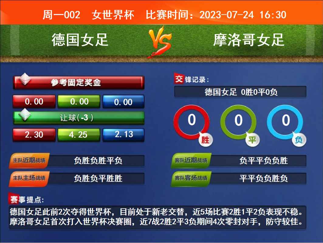 比賽時(shí)間:2023-07-24 16:30賽事提點(diǎn):德國女足此前2次奪得世界杯,目前處于新老交替,近5場比賽2勝1平2負(fù)表現(xiàn)不穩(wěn)。摩洛哥女足首次打入世界杯決賽圈,近7戰(zhàn)2勝2平3負(fù)期間4次零封對(duì)手,防守較佳。
