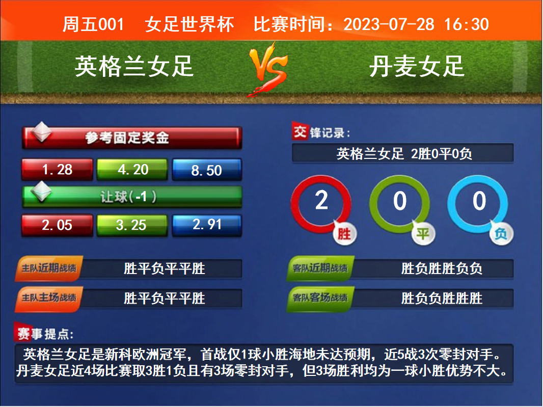 比賽時(shí)間:2023-07-28 16:30賽事提點(diǎn):英格蘭女足是新科歐洲冠軍,首戰(zhàn)僅1球小勝海地未達(dá)預(yù)期,近5戰(zhàn)3次零封對(duì)手。丹麥女足近4場(chǎng)比賽取3勝1負(fù)且有3場(chǎng)零封對(duì)手,但3場(chǎng)勝利均為一球小勝優(yōu)勢(shì)不大。