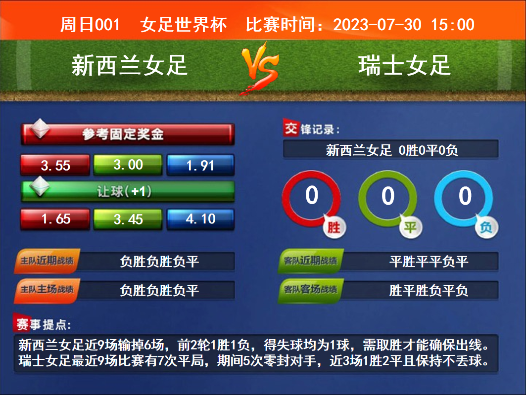 比賽時間:2023-07-30 15:00賽事提點:新西蘭女足近9場輸?shù)?場,前2輪1勝1負(fù),得失球均為1球,需取勝才能確保出線。瑞士女足最近9場比賽有7次平局,期間5次零封對手,近3場1勝2平且保持不丟球。