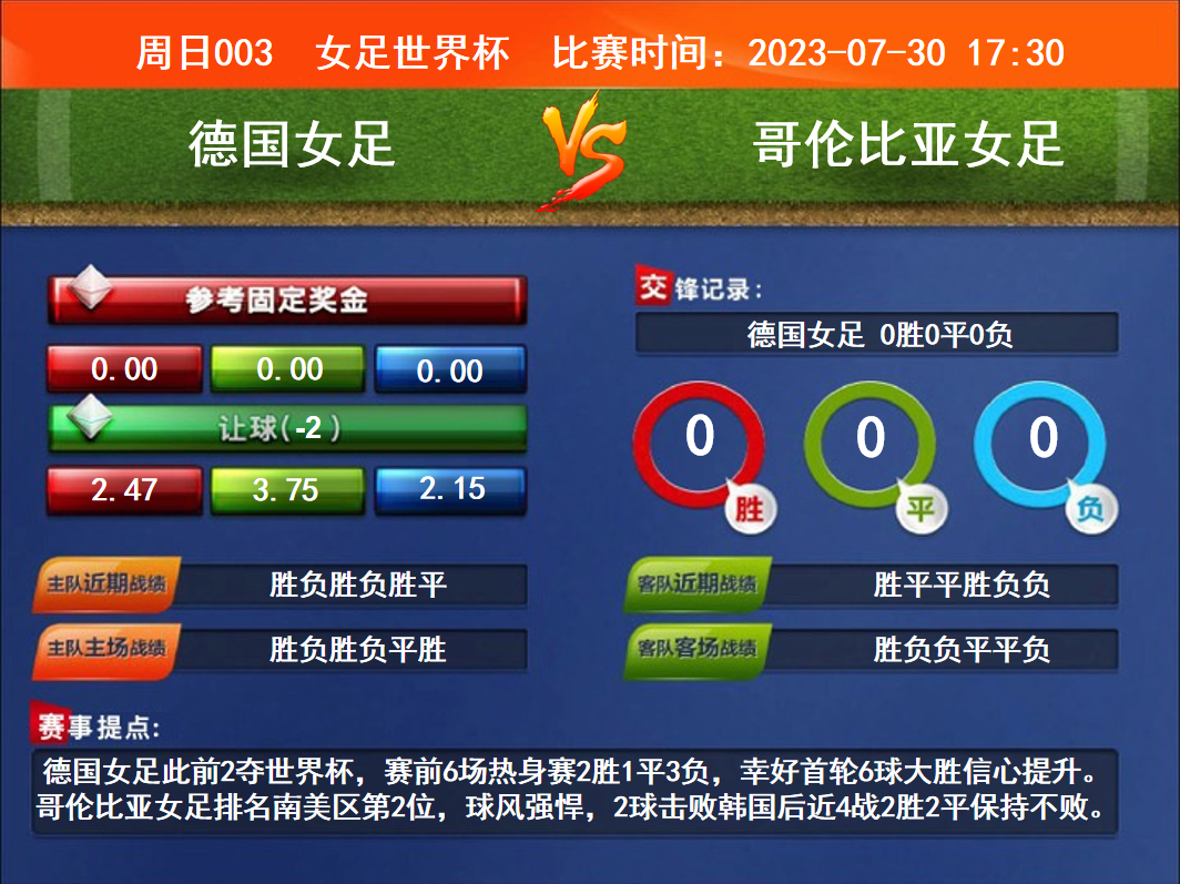 比賽時間:2023-07-30 17:30賽事提點:德國女足此前2奪世界杯,賽前6場熱身賽2勝1平3負(fù),幸好首輪6球大勝信心提升。哥倫比亞女足排名南美區(qū)第2位,球風(fēng)強悍,2球擊敗韓國后近4戰(zhàn)2勝2平保持不敗。