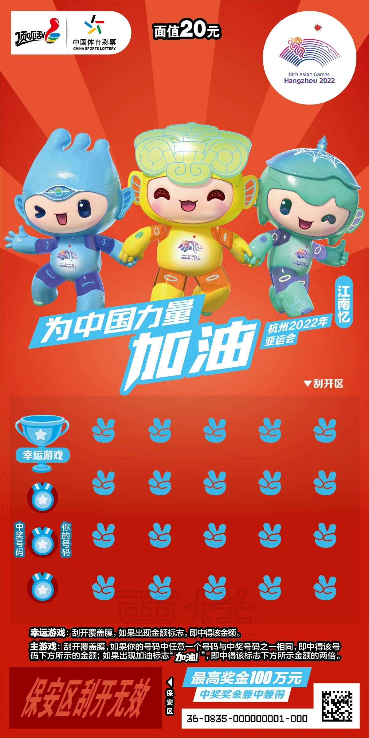 在杭州亞運(yùn)會(huì)開(kāi)幕倒計(jì)時(shí)200天之際,浙江體彩推出“為中國(guó)力量加油”杭州亞運(yùn)會(huì)主題即開(kāi)型體育彩票,票面以亞運(yùn)會(huì)吉祥物“琮琮”“蓮蓮”“宸宸”為主體形象,將具有親和力的吉祥物與充滿活力的網(wǎng)球、游泳、籃球、乒乓球等體育運(yùn)動(dòng)相結(jié)合,以動(dòng)感時(shí)尚形式展示亞運(yùn)會(huì)賽事項(xiàng)目。