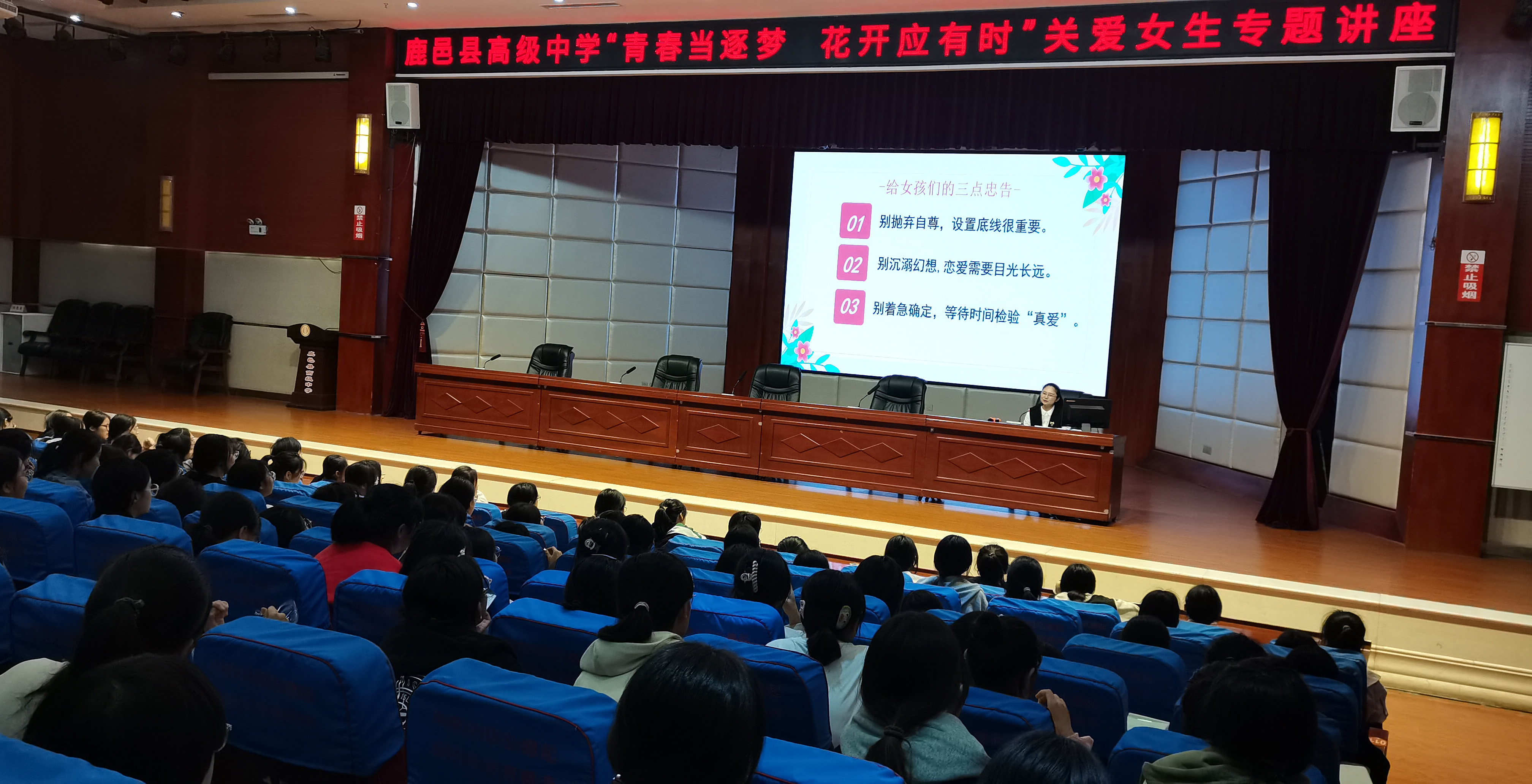 9月26日、27日晚,鹿邑縣高級中學舉行兩場以“青春當逐夢,花開應有時”為主題的關愛女生專題講座。講座進一步推動學校心理健康教育工作,幫助學生提高心理健康水平,引導女生正確認識青春期心理及生理上的變化,樹立積極向上的人生觀。此次專題講座由學校婦委會主任夏寧主持。