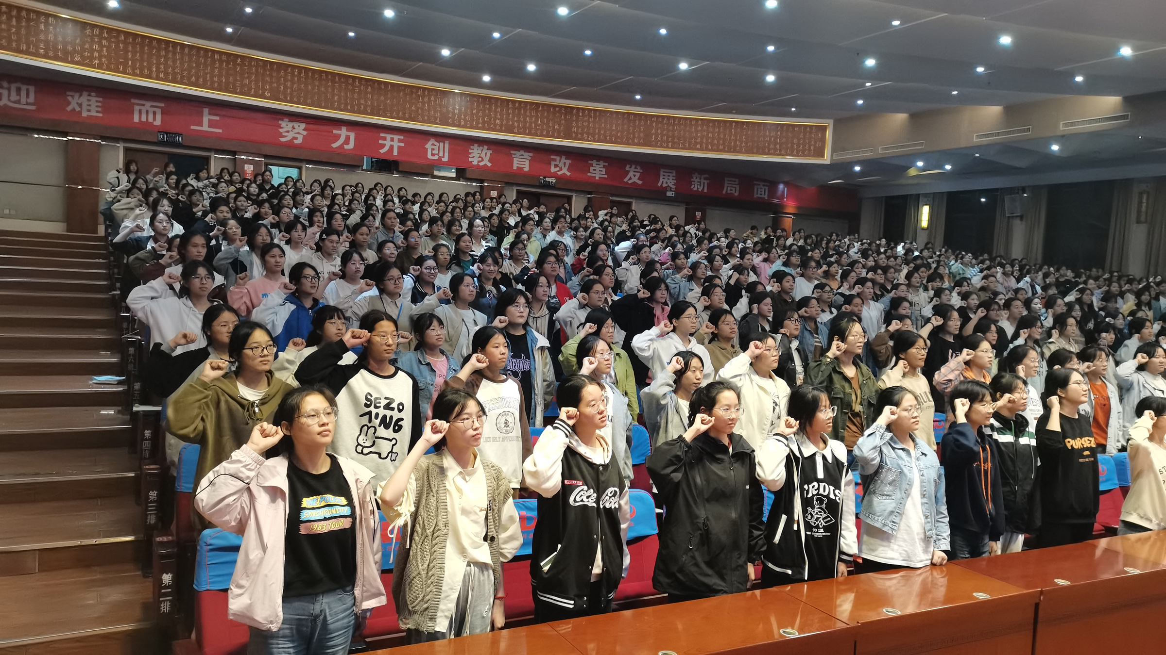 最后,在劉老師的帶領下全體同學舉起右拳莊嚴宣誓:做堅強不屈的女生,做自強不息的女生,做拼搏奮斗的女生......