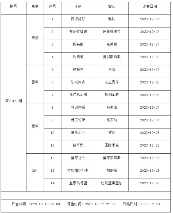 足球彩票勝負游戲(14場和任選9場)第23168期: