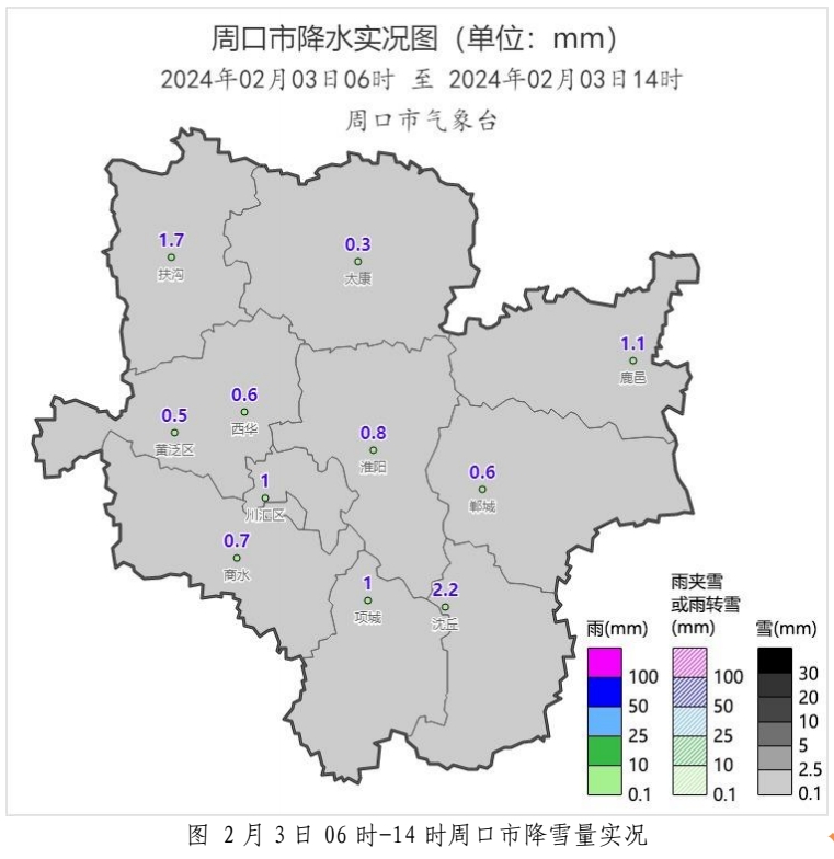 雪深:2月3日14時(shí)各縣市區(qū)雪深(厘米):項(xiàng)城8.5、沈丘8.0、西華8.0、扶溝 7.0、黃泛區(qū) 7.0、商水6.8、太康6.5、川匯區(qū)6.5、淮陽(yáng)5.0、鹿邑4.0、鄲城2.4。