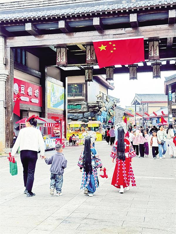 10月7日,游客身著傳統(tǒng)民族服飾,漫步在周口建業(yè)運(yùn)河古鎮(zhèn)。她們一襲華裳,略施粉黛,與古色古香的建筑融為一體,讓人仿佛置身于一場(chǎng)時(shí)空穿越之旅,營(yíng)造了喜慶的節(jié)日氛圍。