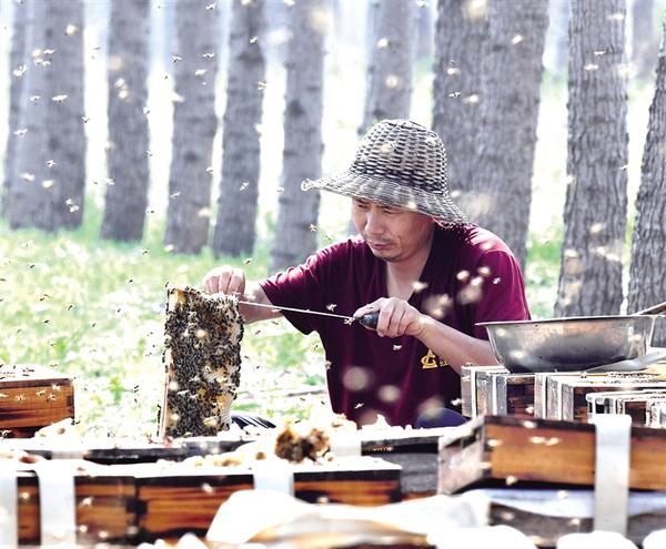 3月31日上午,西華縣李大莊鄉(xiāng)的潁河岸邊,來自遲營鎮(zhèn)的蜂農(nóng)在金黃的油菜花、粉嫩的桃花花海中放蜂采蜜,在春光花影中迎來一年中最忙碌的時節(jié)。