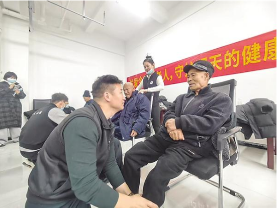 3月7日,志愿者在幫老人按摩。當(dāng)日,市中小企業(yè)商會(huì)聯(lián)合愛心人士來到川匯區(qū)中心敬老院開展以“關(guān)愛老人·傳遞溫暖”為主題的公益慰問活動(dòng)。志愿者不僅和老人拉家常、為老人按摩,還為他們帶來了米、面、油和醫(yī)用口罩等物品。