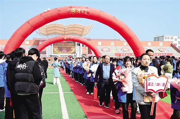 2月27日上午,淮陽中學(xué)運(yùn)動場上洋溢著青春的氣息,一支支朝氣蓬勃的隊伍走過成人門。