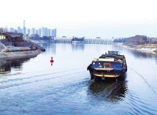 一艘貨船緩緩駛過南寨歷史文化街區(qū)大渡口,水波蕩漾間,將千年古渡與現(xiàn)代航運(yùn)相連。