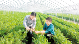 在扶溝縣汴崗鎮(zhèn)越秀蔬菜種植園區(qū),技術(shù)人員正在查看胡蘿卜長勢。該鎮(zhèn)大力推進(jìn)種植業(yè)結(jié)構(gòu)調(diào)整,流轉(zhuǎn)1300多畝耕地,建成了全國最大面積的單片反季節(jié)胡蘿卜種植基地,預(yù)計每畝產(chǎn)值可達(dá)萬元。(記者 王泉林 攝)