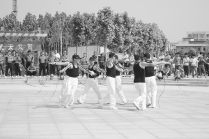 為進(jìn)一步推動(dòng)全民健身活動(dòng)的深入開(kāi)展,項(xiàng)城市啟動(dòng)了“全民健身月”活動(dòng),讓市民積極投身到全民健身行列中,努力使體育鍛煉經(jīng)?;€(gè)人健身生活化。圖為5月18日項(xiàng)城市鞭陀協(xié)會(huì)的會(huì)員正在進(jìn)行鞭陀健身展演。