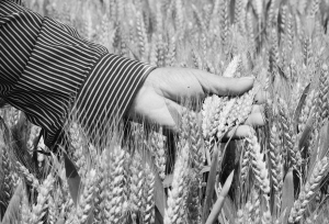 5月26日,河北省河間市孫莊村農民在麥田里查看小麥長勢。