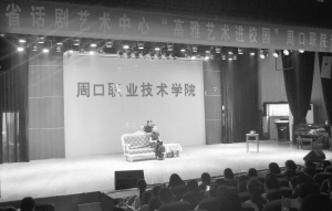 6月9日下午,由河南省教育廳、文化廳、財政廳主辦的2015年“高雅藝術(shù)進校園”——省話劇藝術(shù)中心專場演出在周口職業(yè)技術(shù)學院礪德廳舉行。激情的舞臺對白、絢麗的歌舞場景,話劇藝術(shù)中心的演員們聯(lián)袂為800余名師生獻上了一場視聽盛宴。(孫先鋒 攝)