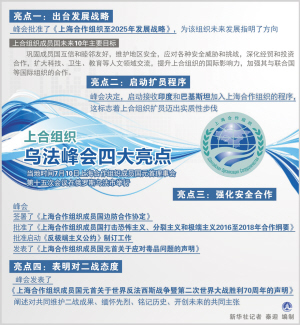 烏法,見證金磚國家新開發(fā)銀行籌備工作全面展開,應(yīng)急儲備安排正式啟動;見證上合組織成立14年來首次擴員,印度和巴基斯坦加入上合組織的程序啟動,白俄羅斯成為觀察員國,阿塞拜疆、亞美尼亞、柬埔寨、尼泊爾成為對話伙伴國……新興和發(fā)展中國家伙伴關(guān)系日益密切。
