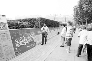 7月1日至3日,太康縣國土資源管理局組織開展建黨94周年紅色宣傳活動。圖為該局退休職工韓其功義務向行人講解毛澤東、周恩來、劉少奇等老一輩無產(chǎn)階級革命家的豐功偉績,傳播時代正能量。(王立平 封艷華 攝)